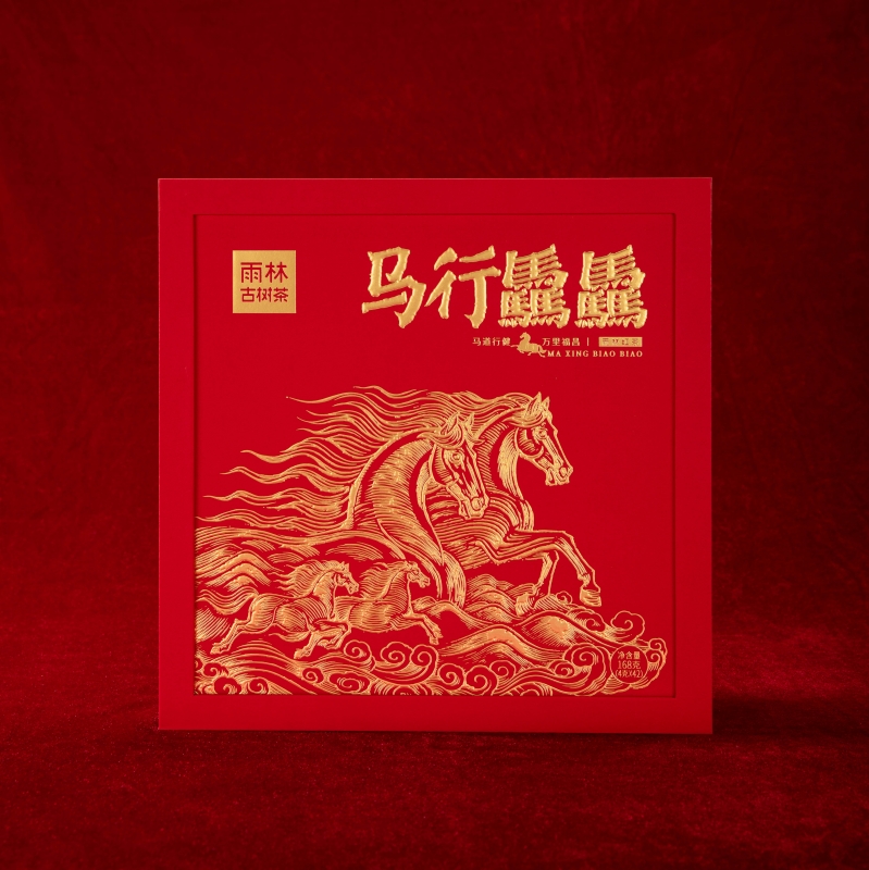 马行新岁,驫驫启运。吉庆礼盒纳红韵,恭贺红马年运势驫行。古树一芽一叶,金毫密布。茶汤赤金流光,花香绵延。甜润醇滑,喉韵甘润。独立小袋,易泡便携,好味常伴,鸿运常在。